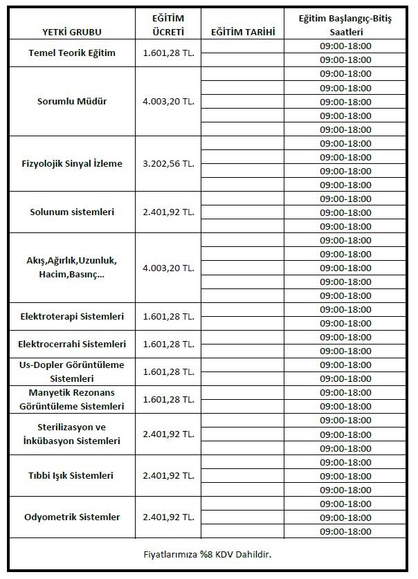 25.07.2022 - 2022 Yılı 2. Dönem Biyomedikal Metroloji Güncel Eğitim Fiyatları
